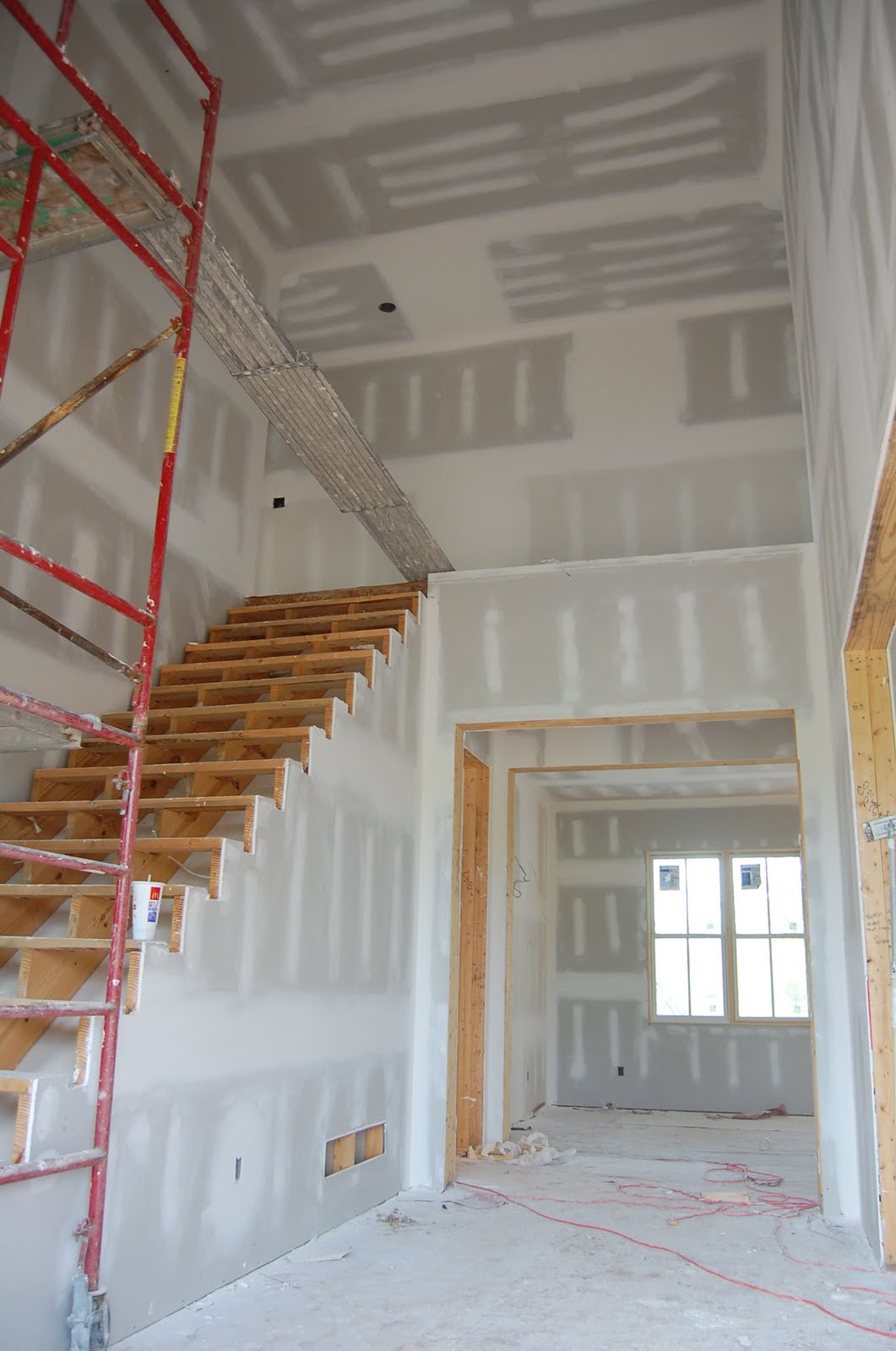 I have been really busy lately, so I haven't caught up on the house on my blog. Here is a quick update... It hasn't been very exciting since electic, drywall and plumbing have been the bulk of the work over the last four week. It is truly looking like a home and we are so excited to just GET OUT THERE!!!! The hardwoods start to go in in about a week and should take about four weeks. I have the trim package nailed down (very fun and creative and different!) and most of our lighting is decided. It is really coming together beautifully.